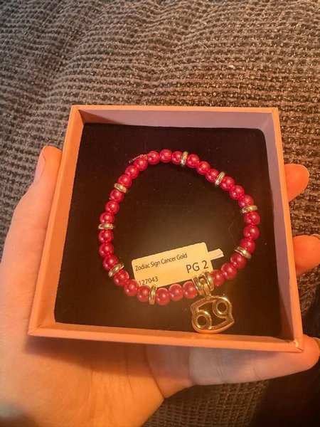 Fint armband med ett guld stjärntecken med stjärntecknet kräftan. Armbandet har burgundy pärlor och guldfärgade detaljer. Kommer i ask, asken ingår!