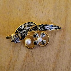 Brosch i någon metall. Med guldfärgad pärla. Pärlan känns som plast.