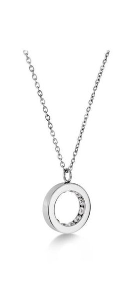 Elegant halsband med ett cirkelformat hänge prytt med gnistrande stenar. Kedjan är tillverkad i silverfärgat material.