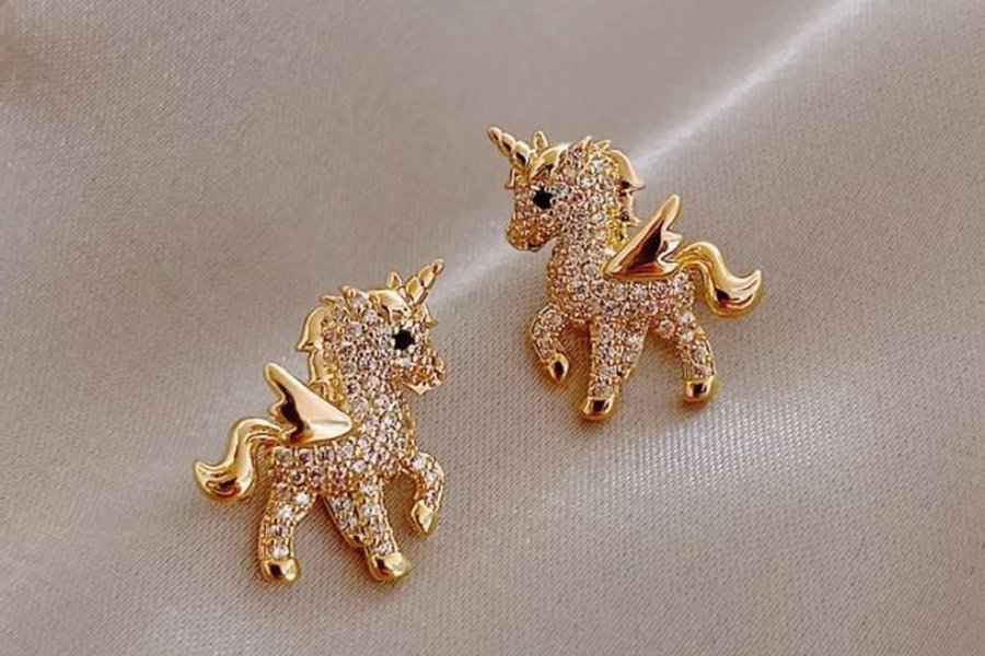 Ett par örhängen i form av enhörningar. Guldpläterade med detaljer.