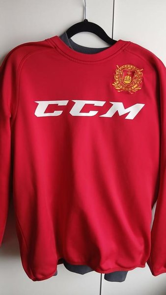 Röd tröja med långa ärmar och rund halsringning. Tröjan har en vit CCM-logotyp tryckt på framsidan och ett broderat märke i guld och rött på höger bröst.