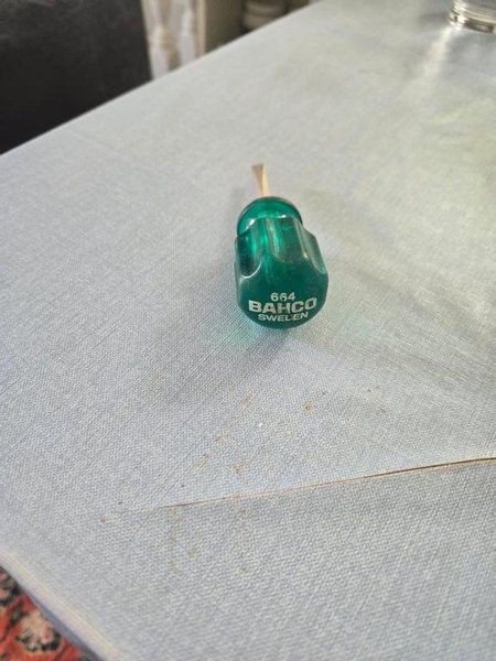 En Bahco skruvmejsel med grön handtag 49 mm,spets 5,5, stål 45 mm Modellen är 664 och tillverkad i Sverige.