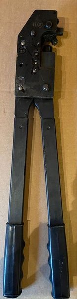 Crimpverktyg med svarta handtag. Verktyget har en mekanism för att pressa ihop material.