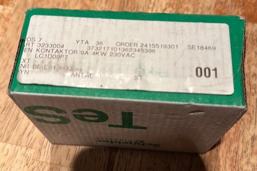 Kontaktor från Schneider Electric. Modell: LC1D09P7. Specifikationer: 9A, 4kW, 230VAC.