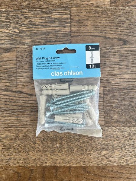 Detta är ett paket med väggpluggar och skruvar från Clas Ohlson. Skruvarna är blankförzinkade och väggpluggarna är 8 mm. Artikelnumret är 40-7614.