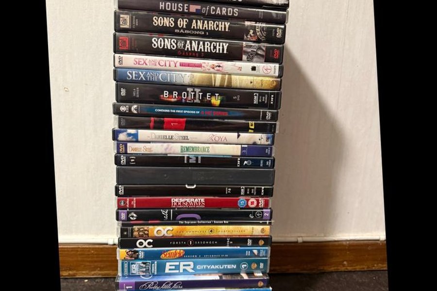 Säljer en samling DVD-filmer med olika TV-serier och filmer. Inkluderar titlar som House of Cards (säsong 3, 4 och 5), Sons of Anarchy (säsong 1 och 3), Sex and the City (filmen och 2), Brottet, Danielle Steel - Roya, Danielle Steel - Remembrance, Desperate Housewives (säsong 6), The Sopranos (säsong 1), OC (säsong 1 och 4), Seinfeld (säsong 3), Akuten, Pretty Little Liars, Solsidan, Svenska Hjärtan (säsong 1) och Sex and the City (säsong 1).