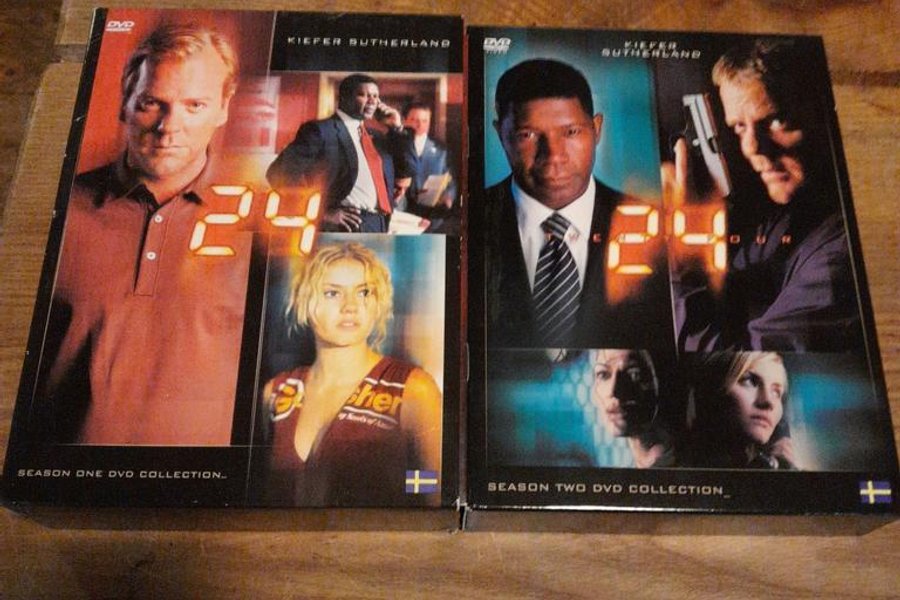 Komplett DVD-box med säsong 1 och 2 av den spännande TV-serien 24 med Kiefer Sutherland.