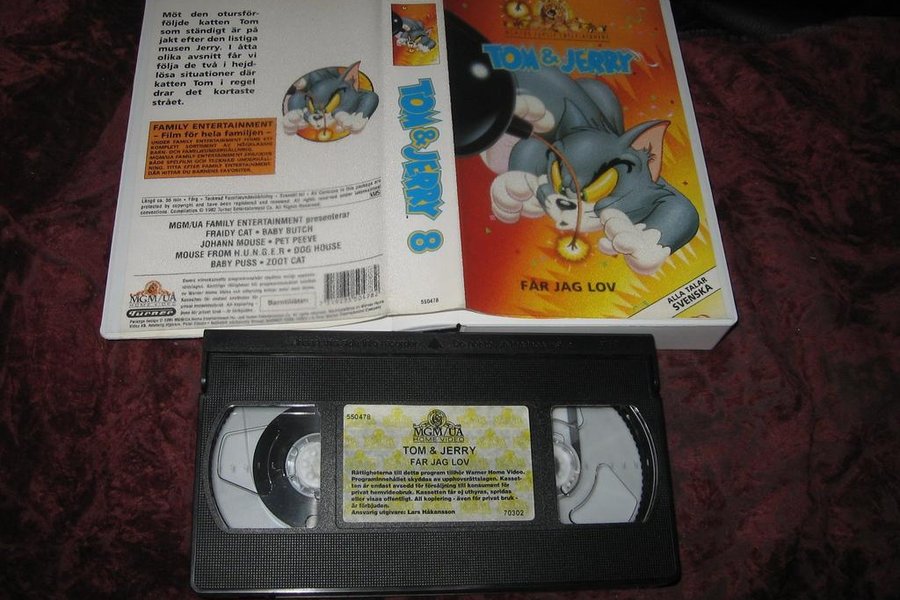 Svensk version av Tom & Jerry på VHS. Innehåller åtta tecknade avsnitt.