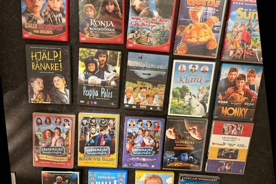 Ett paket med 20 DVD-filmer för barn och familj. Inkluderar titlar som Pinguinresan, Hallå Hallå, Kenny Starfighter, Lassemajas Detektivbyrå, Monky, Klara, Kyrkogårdsön, Pappa Polis, Hjälp Rånare, Ronja Rövardotter, Kalle Blomkvist, Mer om oss barn i Bullerbyn, Gustaf, Sun