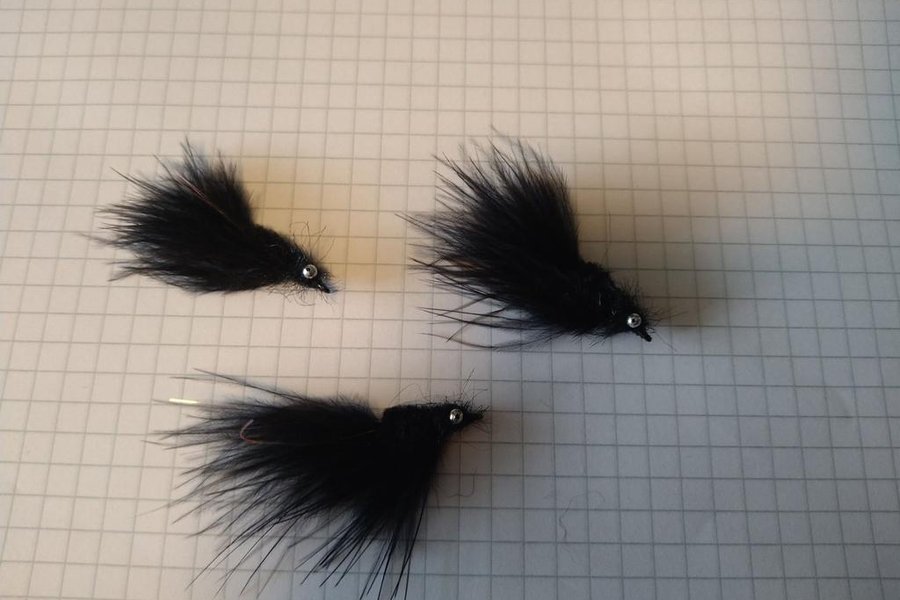 Tre svarta flugor med fjädrar och glittrande ögon. Passar bra för olika typer av fiske. Idealisk för den som vill ha variation i sin flugask.