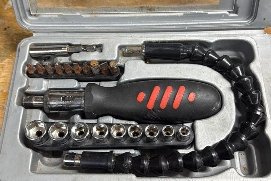 Verktygsset innehållande skruvmejsel, bits och tillbehör. Perfekt för diverse reparations- och monteringsarbeten.