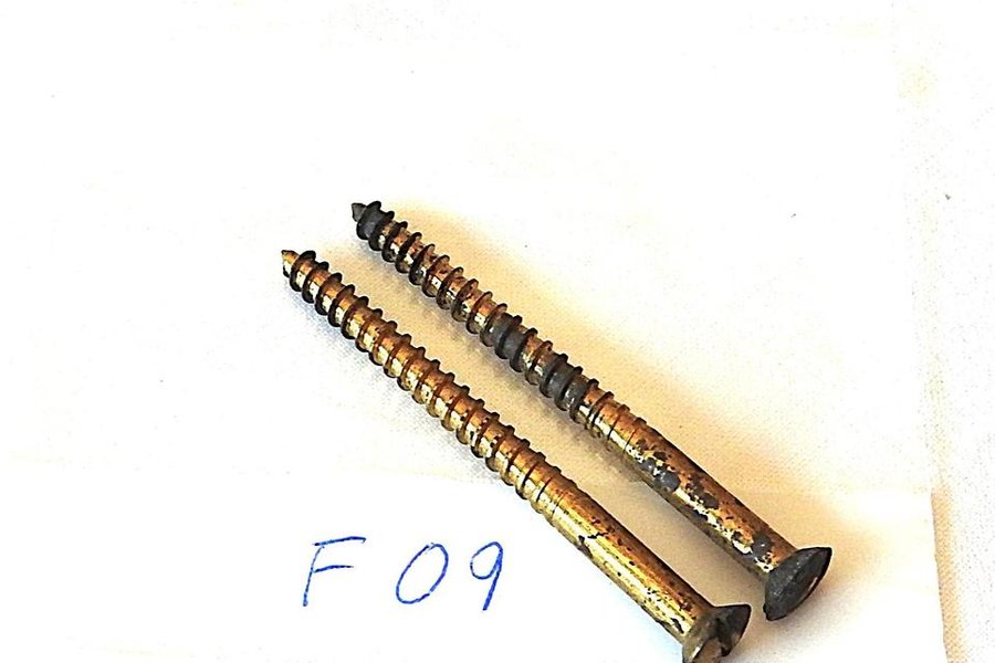 2 st.obegagnade träskruvar av massiv mässing. Kullerförsänkt spårskalle.