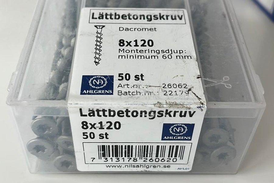 Lättbetongskruv av typ Dacromet, storlek 8x120. Monteringsdjup: minimum 60 mm. Artikelnummer: 26062. Batchnummer: 22179.