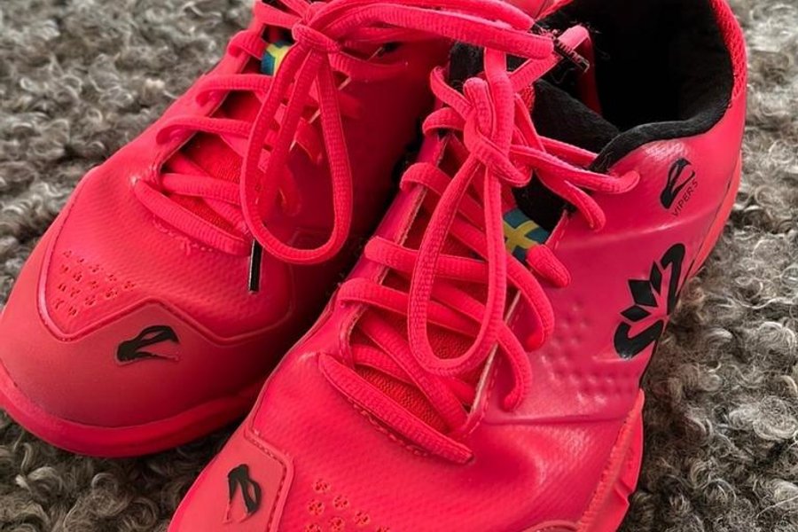 Salming Viper innebandyskor i rosa färg. Skorna har snören och detaljer i svart. Stl 36,5
