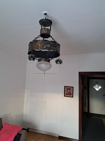 En taklampa med unik och dekorativ design. Lampan har en rustik känsla med detaljer i metall och glas.