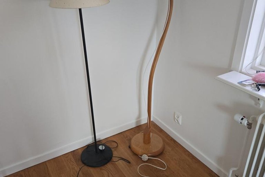 Två golvlampor i olika stilar. Den ena är en klassisk golvlampa med en beige lampskärm och svart fot. Den andra är en böjd golvlampa i trä med en vit lampskärm.