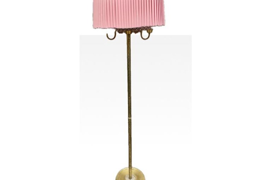 Vintage golvlampa med en rosa plisserad skärm och mässingsfärgad fot. Lampan har detaljerade mönster på stången och foten. Ålder ca 39-50 talet. Lite lagat i ett veck. Hämtas i Helsingborg.