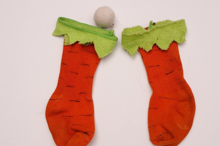 Hemmagjorda tillbehör till en liten fin kanin, boll till svans och strumpor medmorotsblast runt anklarna och mrotsstrumpor. Passar ca 2-3 år.