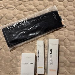 Virena set med brun utan sol produkter. Innehåller en Velvet Luxe Self-Tan Back Applicator, Taneraser, Perfect Tan Self-Tan Face Drops och Perfect Tan Self-Tan Mousse.