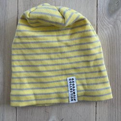 Gul och grå randig mössa från Geggamoja Collection. Det står tyvärr inte någon exakt storlek på den förutom Baby, har mätt lite (se bilder). Ny med prislappen kvar.