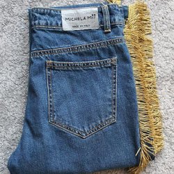 Ett par blå jeans med dragkedjor vid bensluten och två dekorativa knappar i midjan. Låg midjade och lite vintage