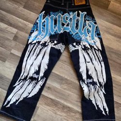 Coola, mörkblå jeans med ett stort tryck av vingar och texten "Hustla" i blått och vitt. Jeansen har vita kontrastsömmar och en ledig passform.