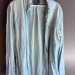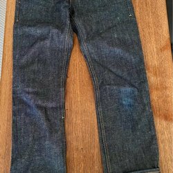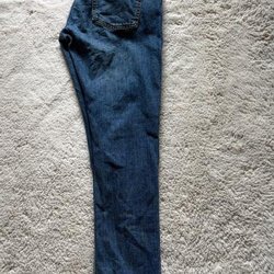 Jeans med en ljusblå tvätt och en klassisk femficksmodell. De har en knappgylf och bälteshällor runt midjan. Bakfickorna är prydda med diskreta sömmar och en liten logotypdetalj. En läderlapp med präglad logotyp sitter baktill i midjan.