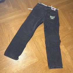 Denna annons inkluderar tre par byxor: ett par svarta jeans från H&M i skinny fit, ett par ljusblå jeans från Weekday i slim fit, och ett par svarta kostymbyxor från Dahléns. Begagnade så slitage förekommer. Ett skärp ingår.