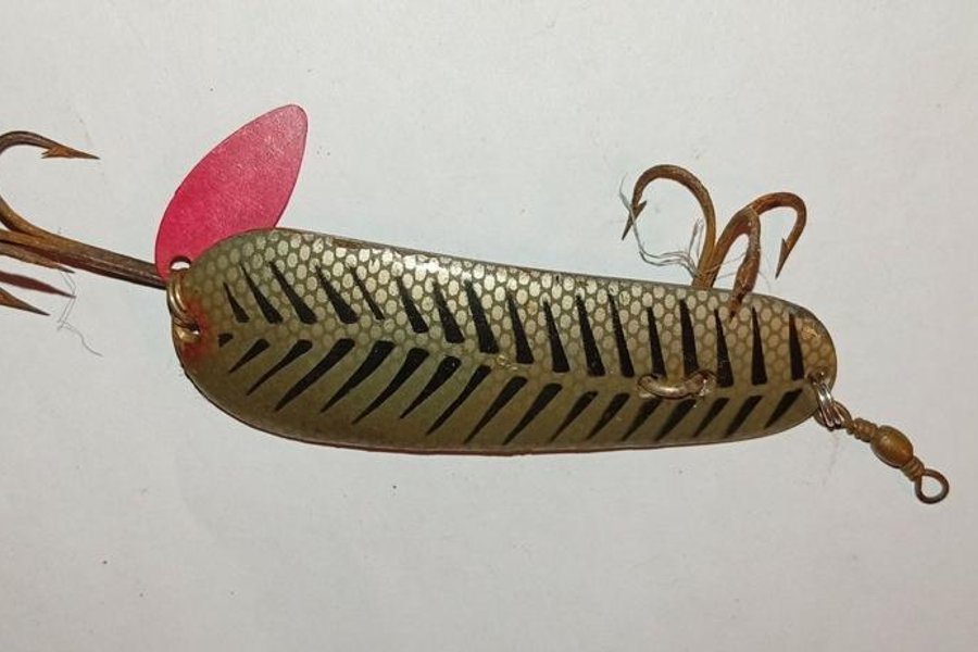 Detta fiskedrag har en unik design med en metallisk yta och en röd del. Passar för fiske i olika vatten. Observera att det är utrustat med två krokar.