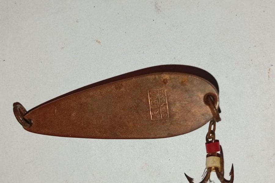 En Abu spinnare med krok. Tillverkad av metall. Passar för fiske och kan användas för olika typer av fiskeaktiviteter.