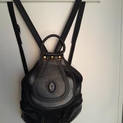 Svart ryggsäck med dragsko och spännen. Den har två fickor fram. Lätt, rymlig och i utmärkt skick.