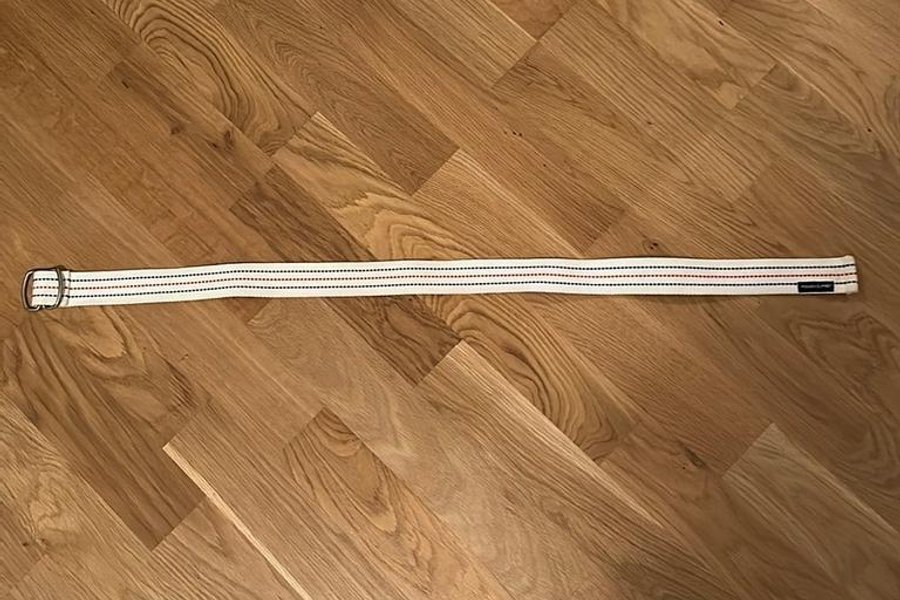 Ett stilrent bälte i en ljus färg med tunna ränder i rött och mörkblått. Bältet har ett silverfärgat spänne.