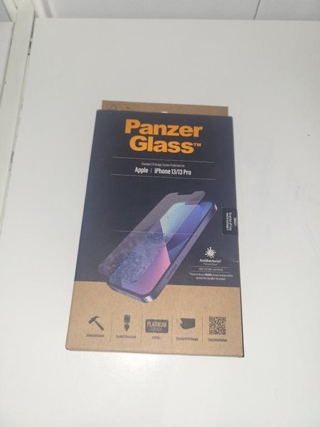 PanzerGlass skärmskydd för Apple iPhone 13/13 Pro. Standard Fit Design med Platinum Strength. Antibakteriellt skydd certifierat enligt ISO 22196. Shock Resistant, Scratch Resistant, Easy Installation.