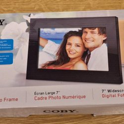 Coby DP700 digital fotoram med en 7" widescreen TFT LCD-färgskärm. Ramen visar JPEG-filer och har funktioner för kalender och klocka. Den är utrustad med kortplats för SD, MMC och MS, samt en USB-port för användning av USB-minne. Väggmontering är möjlig och ett löstagbart bordsställ medföljer.