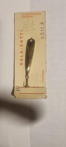 Fiskekrok från KALA-ANTTI, designad för fiske. Den är fäst vid en kort pappersetikett med information. Passar för olika fiskeformer.