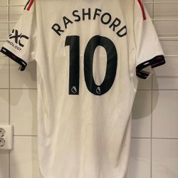 Officiell Vit Manchester United bortatröja säsongen 2022/2023 med Rashford och nummer 10 tryckt på ryggen. Adidas logga och Manchester United klubbmärke på bröstet. Sponsor logga TeamViewer på magen. Ny pris 1600 mitt pris 999