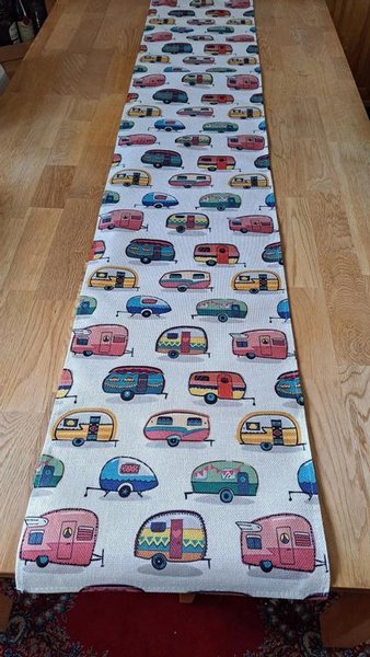 Bordslöpare med ett mönster av färgglada husvagnar.