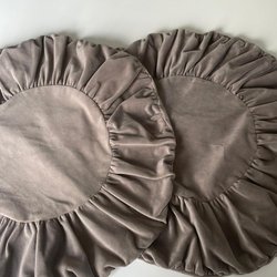 Eleganta runda kuddfodral i sammetstyg med en volangkant runt om. Försluts med dragkedja. Material: 100% Polyester. Nougatfärgade. Mått på kuddfodralen är 47 * 47 cm. Två stycken.