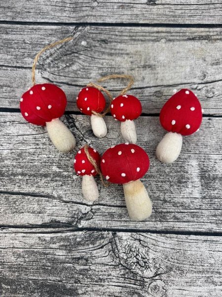 Set med dekorativa svampar med röd hatt och vita prickar. Perfekt som prydnad.