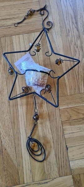 Ljushållare i form av en stjärna i metall och glas. Glaset är bärnstensfärgat. Mått ca 20x20 cm.