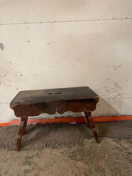 Pall tillverkad i trä. Den har en rektangulär sits med ett utskuret handtag i mitten. Sitsen har vågiga kanter. Benen är snedställda.