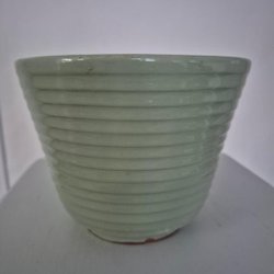 Kruka från Uppsala Ekeby i brun färg. Den har en räfflad utsida och en slät insida. Etiketten "Uppsala-Ekeby Sweden" sitter på sidan.