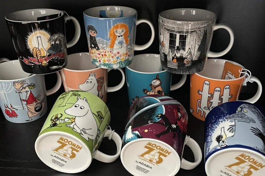 Ett set med Muminmuggar från Arabia, utgivna för att fira Mumins 75-årsjubileum. Muggarna är diskmaskinssäkra, mikrovågssäkra och ugnssäkra.