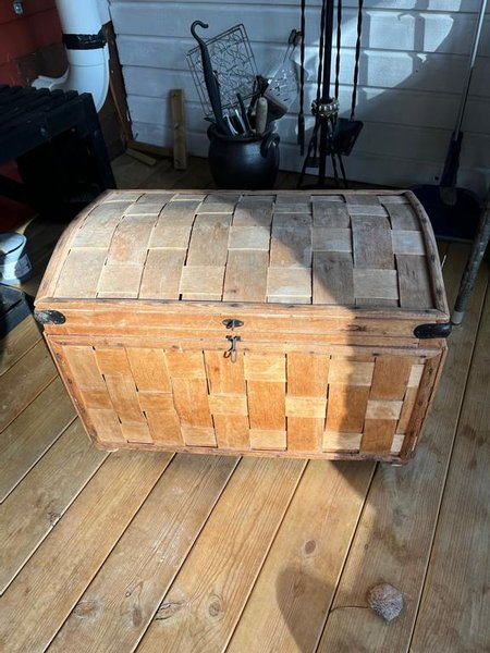 En träkista med ett välvt lock. Kistan har flätade detaljer och metallbeslag.
