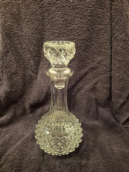 Karaff i glas med mönstrad botten och propp.