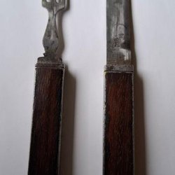 Brödskärare från Raadvad i Danmark. Skäraren är i metall och trä. Den har ett handtag i trä och en sågtandad klinga.