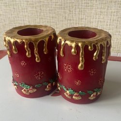 Två röda ljusstakar med julmotiv.