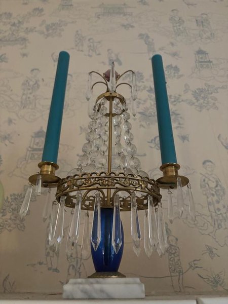 Elegant kandelaber med vackra prismor. Den har plats för två ljus och en dekorativ blå detalj i mitten. Perfekt för att skapa en stämningsfull atmosfär i hemmet och på middagsbordet.
