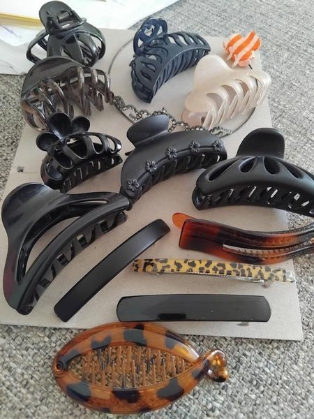 Et parti med forskellige hårklemmer og hårspænder. Indeholder store og små hårklemmer i sort, beige og mørkeblå. Der er også en hårklemme med blomsterdetaljer og en med similisten. Derudover er der flere hårspænder, herunder en med leopardprint og en bananklemme i skildpaddemønster.