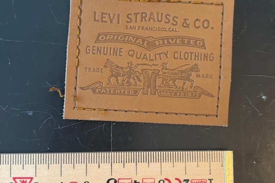 Läderlapp från Levi Strauss & Co. Märkt med "Original Riveted Genuine Quality Clothing, Trade Mark, Patented May 20 1873".